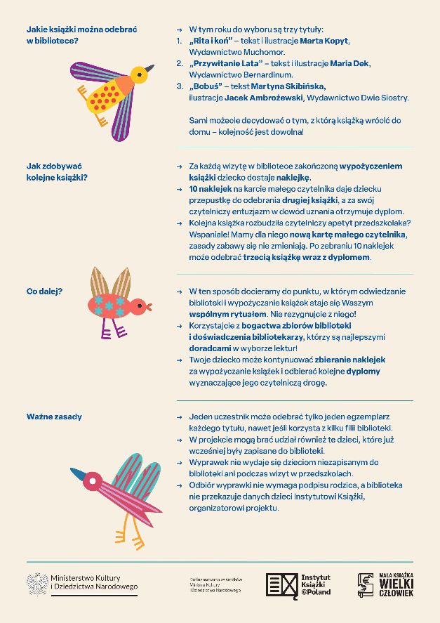 * Jedna z trzech książek do wyboru : "Rita i koń" Marty Kopyt, "Przywitanie lata" Marii Dek, "Bobuś" Martyny Skibińskiej oraz poradnik dla rodziców :"Książką połączeni, czyli przedszkolak idzie do biblioteki".