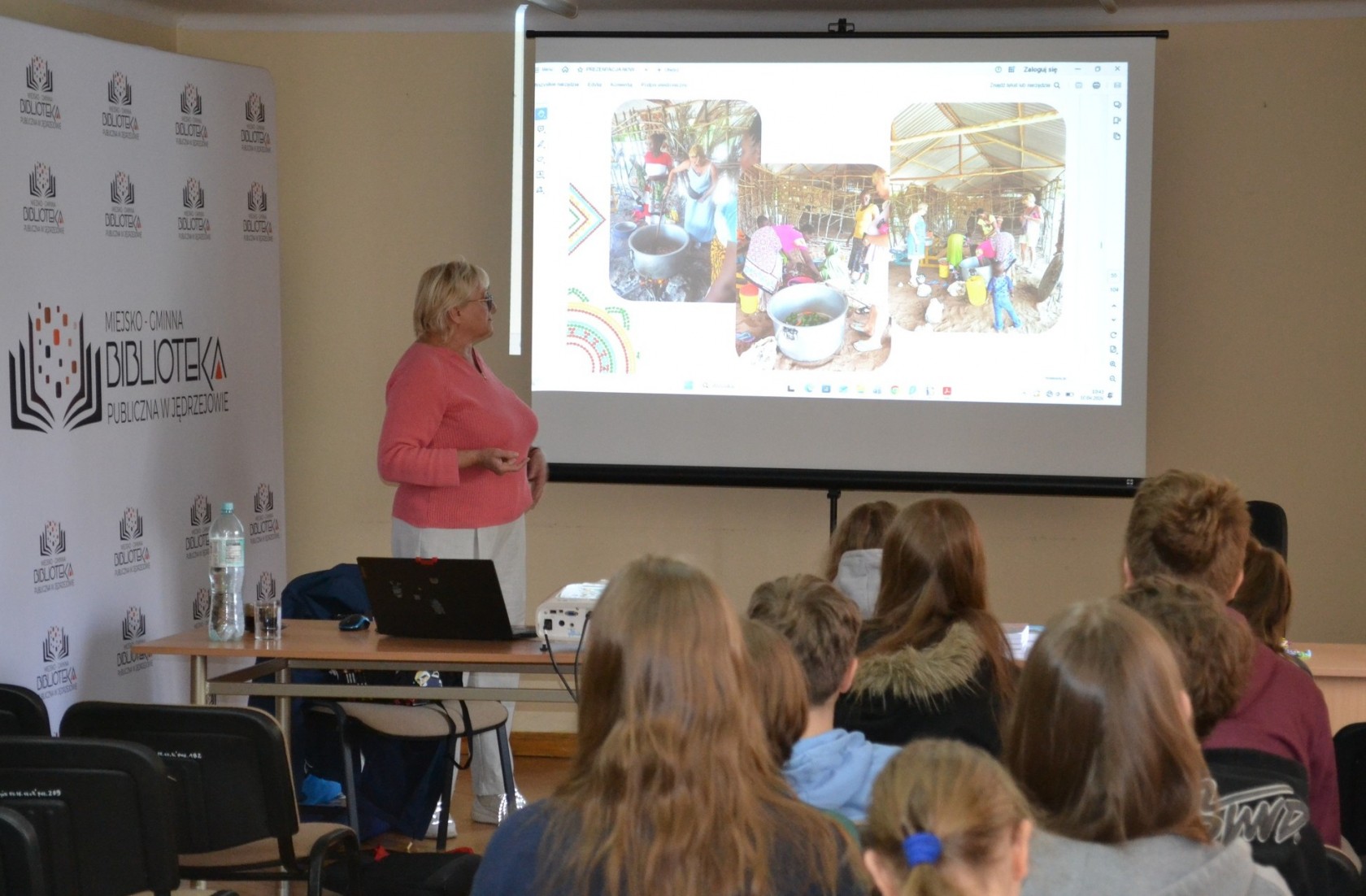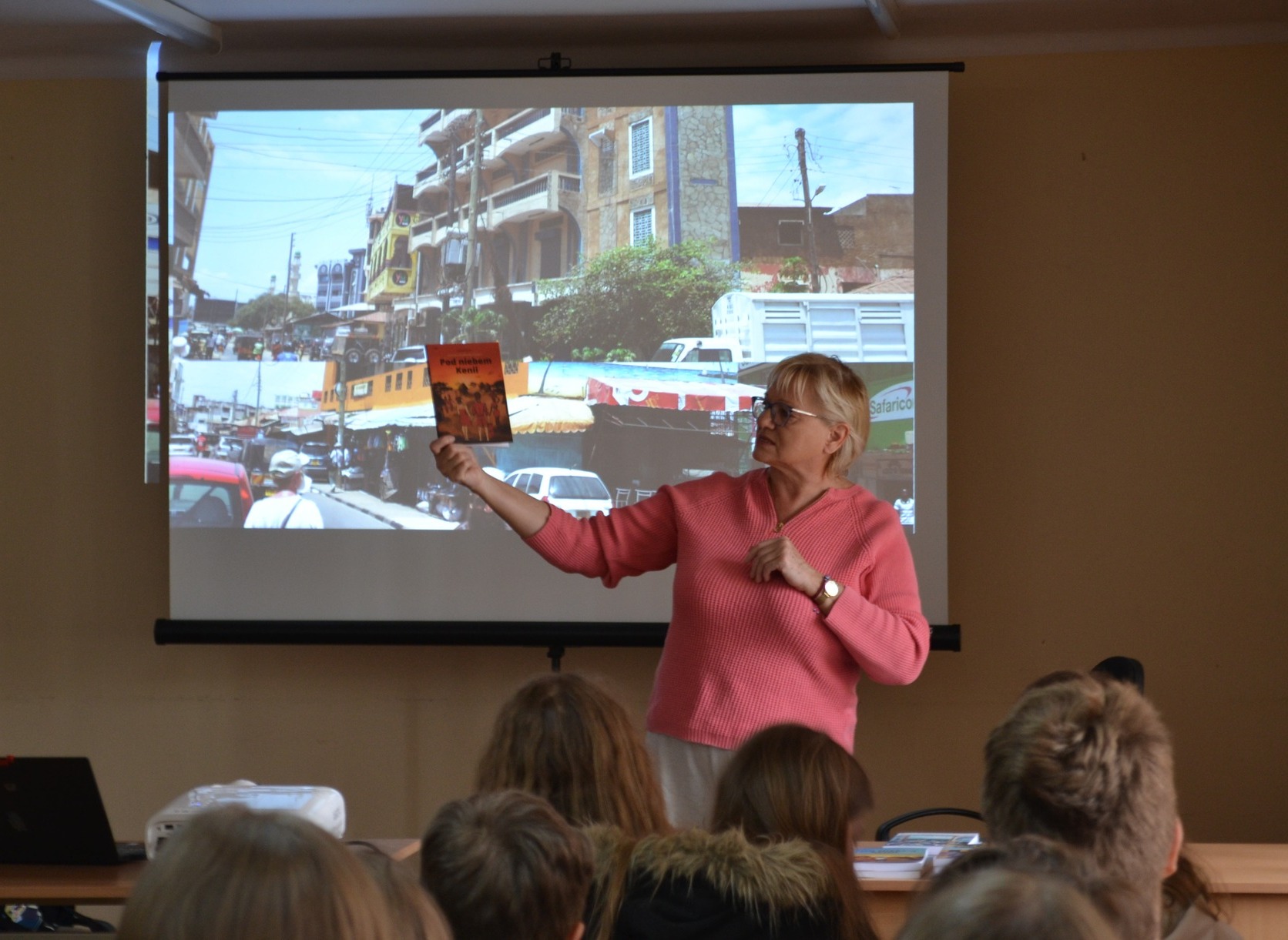Pani Mariola w ciekawy i poruszający sposób opowiedziała zgromadzonej młodzieży jak wygląda codzienne życie kenijskich dzieci na wybrzeżu- ich szkoła, obowiązki, radości i marzenia. Jakie wyzwania niesie życie w tym afrykańskim kraju, np. problem głodu, biedy. Opowiedziała również o swoich działaniach społecznych dla lokalnych dzieci, nauczaniu ich języka włoskiego, budowie szkoły oraz biblioteki. Dzięki tej opowieści uczniowie mogli z bliska poznać rzeczywistość rówieśników z innego kontynentu.